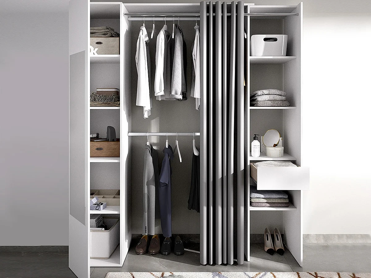 offener kleiderschrank mit schublade und modernem vorhang. 2 kleiderstangen. 4 regale. offener schrank mit vorhang.